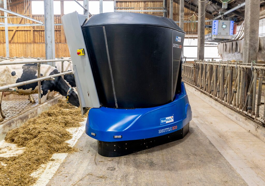 Shuttle Eco este un robot de furajare manevrabil, cu conducere autonoma. Este echipat cu cea mai recenta tehnologie a bateriilor si cu o cuva de amestec realizata dintr-un material rezistent la uzura. Robotul furnizeaza animalelor cantitati precis masurate de furaj proaspat la discretie, 365 de zile pe an.